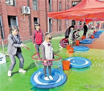 ▲泡泡秀让学生们玩得不亦乐乎。
