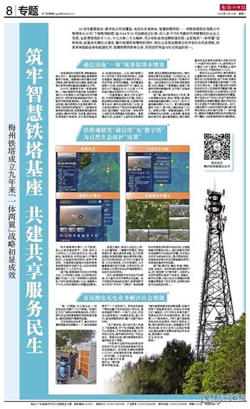 5G信号基塔架设、楼宇室分网络覆盖、电动车共享换电、智慧铁塔视联……中国铁塔股份有限公司梅州市分公司(下称梅州铁塔)自2014年11月挂牌成立以来,深入学习习近平新时代中国特色社会主义思想,全面贯彻党的十八大、十九大和二十大精神,充分依托自身独特资源优势,全面推进“一体两翼”战略布局,在服务支撑行业通信、集约资源降本增效的同时,把行业共享发展理念延伸至社会民生领域,探索布局智能备换电能源应用、智慧铁塔视联等业务,实现经济效益与社会效益的统一。