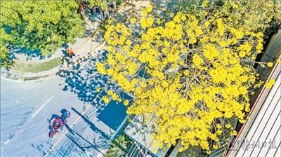 “三五朵花簇拥成花球,婀娜多姿。风一吹,摇下一地‘黄金’,十分好看。”在桂岭大道北邂逅了“一树黄花”的市民涂阿姨禁不住一片片“黄金甲”的“诱惑”,拿出手机与绮丽的黄花风铃合影留念。