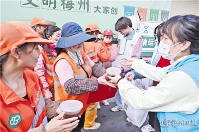 本报讯 (记者张莹娜)1月18日是我国传统节日腊八节。当天,梅江区江南街道鸿都社区新时代文明实践站开展“浓情腊八节,粥到暖人心”志愿活动,为一线工作的环卫工人送上热气腾腾的腊八粥。