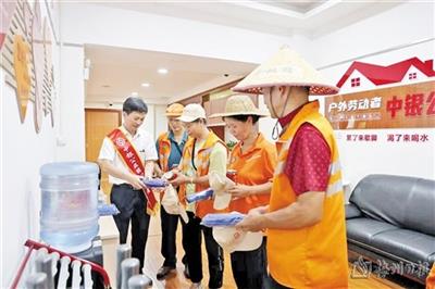 中银公益驿站工作人员为户外劳动者赠送凉茶等降暑用品。(驿站供图)