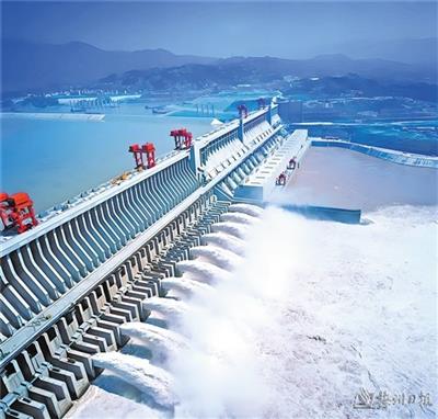 三峡大坝开闸泄洪的壮观景象。