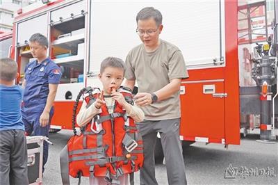 小朋友体验穿消防救援服,化身“小小消防员”。