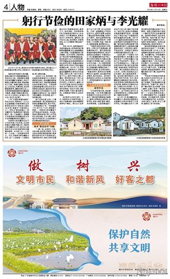 客家先贤田家炳与李光耀,都是从梅州市大埔县高陂镇走出来的杰出人物。田家炳家乡银滩村和李光耀家乡唐溪村,均位于晒袍山东麓、韩江西岸,两地相距约三公里。银滩与唐溪,村如其名,山光水色,风景秀美,宛如两颗璀璨明珠,镶嵌在韩江边上。田家炳故居拱辰楼和李光耀祖居中翰第,都建于清朝光绪年间,2021年10月双双入选“梅州十四大名人故(旧、祖)居”。