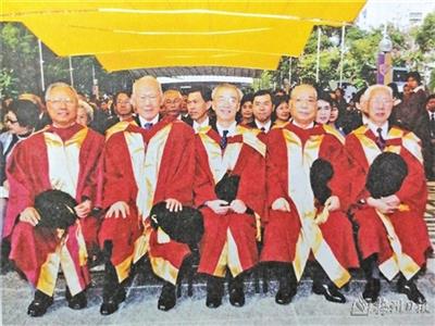 2000年12月7日,香港中文大学举行颁授学位典礼,李光耀(左二)获颁荣誉法学博士学位,田家炳(右一)获颁荣誉社会科学博士学位。