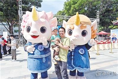 市民与“普法圆宝”“公法圆宝”合影。(钟小丰 摄)