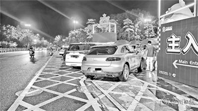院士广场沿线路段违法停放着不少车辆,有些车辆直接停放在了黄色网格线内。(陈坚平 摄)