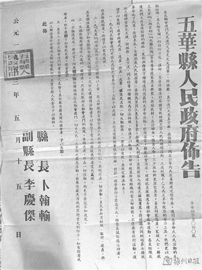 ▶一九五三年五月十五日,五华县人民政府颁布关于取缔反动“会道门”的布告。