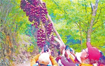 归途的惊喜在路口绽放。紫红禾雀花凌空架起迎宾门,碗口粗的藤蔓横跨山道,绛云般的花瀑垂落如织,千万朵紫红禾雀花如飞洒的水花,似跳动的音符。风过时簌簌落英似天女散花,为行者织就香尘红毯。众人笑靥映花容,快门声中,这天然花门将春日盛景永久封印。