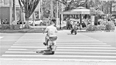两辆非机动车同时闯红灯,快速通过斑马线。(陈坚平 摄)