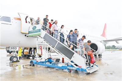 天津航空GS6565航班E190客机平稳降落在梅州机场,旅客走下飞机。 (林翔 摄)