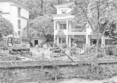 8月6日,工作人员在广东肇庆鼎湖区鼎湖山风景区门口清淤。
