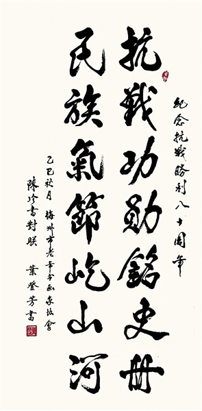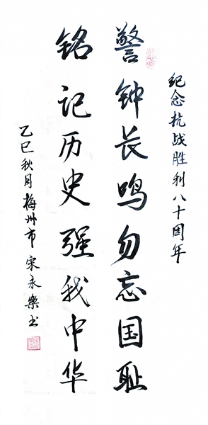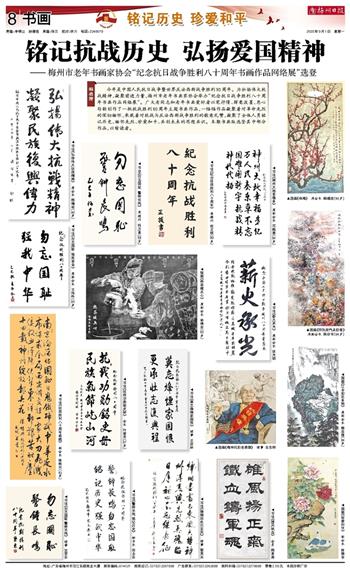 今年是中国人民抗日战争暨世界反法西斯战争胜利80周年。为弘扬伟大抗战精神,凝聚前进力量,梅州市老年书画家协会举办“纪念抗日战争胜利八十周年书画作品网络展”。广大老同志和老年书画爱好者以笔抒情、挥毫泼墨,悉心勾勒创作了一批抗战胜利80周年主题书画作品,一幅幅作品凝聚着对革命先烈的深切缅怀,承载着对抗战与反法西斯战争胜利的敬意礼赞,凝聚了全体人员铭记历史、缅怀先烈、珍爱和平、共创未来的思想共识。本期书画版选登其中部分作品,以飨读者。