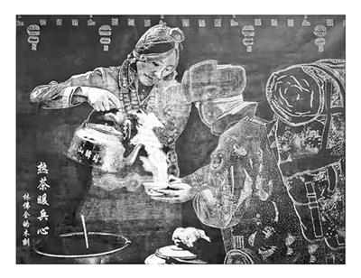 版画《热茶暖兵心》 原副会长 林佛全( 岁) 80