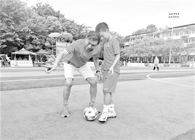 国足原队长池明华与五华县的小球员亲密互动。(赖锋 摄)