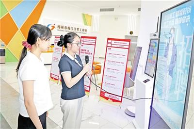 在梅州市世界客商中心(梅州市人力资源服务产业园),一处名为“梅江区零工市场”的平台尤其引人注意,市场内的数字大屏整合了梅州范围内的岗位需求、人力存量等实时信息;在“飞越AI”平台前,求职者只需用指尖触摸屏幕,陈述自己的求职意向,“数字人”小梅就会为其推荐就业岗位,实现人岗精准匹配。除了线下数字化平台,求职者还可以通过“梅好职达”线上小程序,找到全职工作、零工兼职、培训学习,切换“地图寻职”功能查看周边岗位分布情况,并获取最新的人才就业创业政策信息。