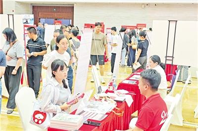 ▲在梅江区高校毕业生现场招聘会上,企业招聘专员与求职者面对面交流。(江婵 摄)