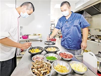 ▲梅江区客家菜博物馆一楼客家美食体验厅(“粤菜师傅”实训基地)内,师傅们正忙碌地备菜。(连志城 摄)