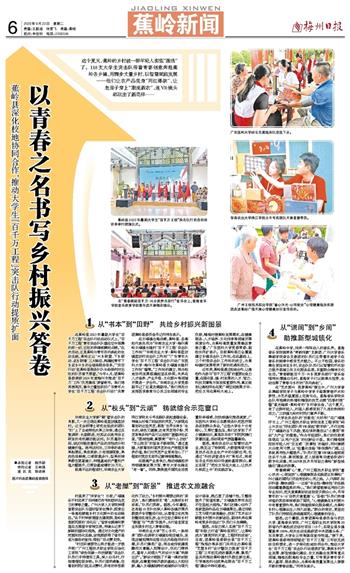 据悉,这个暑假,共青团蕉岭县委员会与武汉大学、星海音乐学院、广州工程职业技术学院等20所省内外高校成功结对项目118个,实现全县乡镇覆盖率100%,相关生动实践获团中央团建头条、广东共青团、大学生云报等媒体宣传报道。“接下来,团蕉岭县委将持续锚定‘百千万工程’三年初见成效目标要求,进一步深化校地协同合作,推动大学生‘百千万工程’突击队行动提质扩面,聚焦乡村产业发展、新型城镇化建设、农文旅融合发展等重点领域,精准匹配高校专业力量,引导更多青年学子深入基层、服务群众,为蕉岭高质量发展注入源源不断的青春动能。”何伟东表示。
