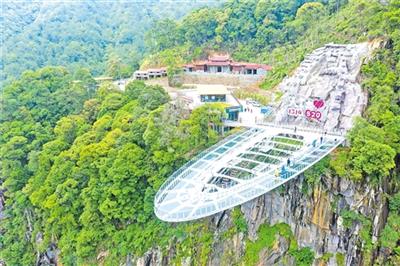 目前,石牛山索道是福建最长的脱挂式索道,总长度约7168米。乘坐石牛山索道,可以一路观赏,穿过竹林峡谷,可俯瞰双瀑奇观(油漏漈瀑布和岱仙瀑布),美不胜收。东侧岱仙瀑布高约184米,雄伟壮观,被誉为“华东第一瀑”。不羁的溪水如烈马脱羁,雄浑奔放,气势非凡;西侧油漏漈瀑布高约120米,宽110多米,瀑水依崖缓流,恰似珠帘下垂,温和婀娜。网红景点“心形栈道”位于岱仙瀑布两侧,从远处看,两边的栈道整体呈一个心形,蜿蜒盘桓在崖壁上,全程约3000米,垂直高差314米。走在悬崖栈道上,凭栏探首,峭险渊深,令人心虚目眩。放眼望去,山峰层峦叠嶂,由近及远,仿佛一幅色彩由浓及淡的中国水墨画。(张联珍)