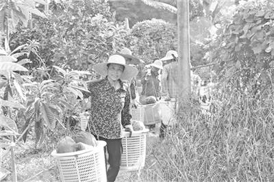 走进蓝坊镇峰口村百香果种植基地,目之所及,绿油油的藤蔓爬满棚架,金黄翠绿的百香果挂满枝头,果实圆润饱满,香气四溢。田间地头,村民们穿梭于藤架之间,娴熟地采摘、分拣,现场勾勒出丰收的甜蜜图景。“我们帮种植基地修缮了眼前的这条灌溉水渠,它之前比较细小,灌溉不方便,也起不到防洪的作用,现在扩大了,基地用水方便很多。”驻蓝坊镇帮镇扶村工作队队长叶帮指着基地旁边的水渠说。