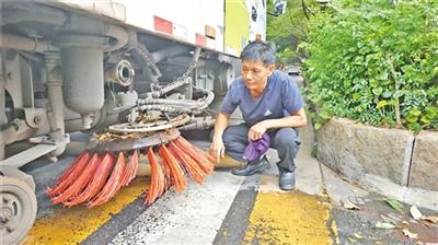 黄今中负责梅县区人民南路、大新路等主干道的清扫工作。每天,黄今中都要跟同事配合,同事的洒水车会先对路面进行冲洗,路面的垃圾和落叶等杂物会被冲到路边,随后黄今中则会开着扫地车沿着路面进行清扫。