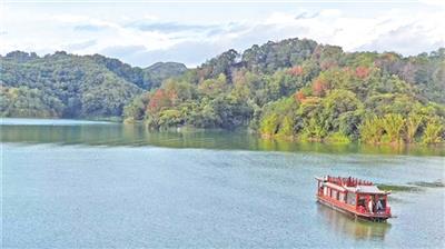 登上古色古香的画舫游船,行于碧波之上,两岸山林茂密,绿得层次分明。深绿的是百年乔木,浅绿的是新抽的枝芽,偶有几株红叶树点缀其间,在夏末的风里摇曳出几分秋的诗意。