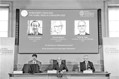 新华社斯德哥尔摩10月8日电 瑞典皇家科学院8日宣布,将2025年诺贝尔化学奖授予北川进、理查德·罗布森和奥马尔·M·亚吉三名科学家,以表彰他们在金属有机框架开发方面所作出的贡献。