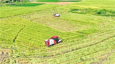 水稻丰收,农户抢抓晴好天气进行收割。(县融媒体中心供图)