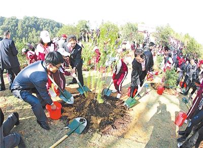 第二届世界客商大会期间,世界客属青年“献爱心·手拉手”暨青年纪念林植树活动在客天下旅游产业园举行,青年代表与贫困学生一起植树。(梅州日报资料图片)