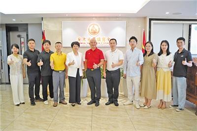 栏目组一行与广东省丰顺商会会长许少林(中)及部分青委会代表合影。