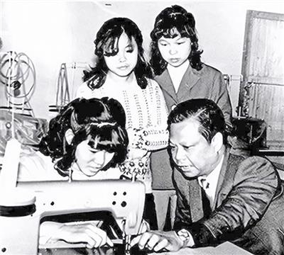 20世纪80年代,在梅州银利来领带厂,曾宪梓教员工制作领带。(金利来集团有限公司供图)