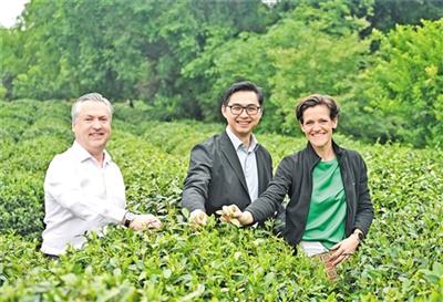 ▲今年,邹祖文(中)带领伯恩济贫院代表团及多位勃艮第著名酒庄庄主走进杭州,在龙井茶园采摘鲜叶。(受访者供图)