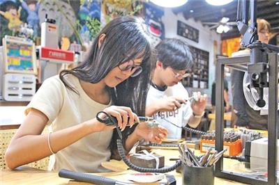 郑思嘉和男朋友正在梅城一家手作DIY店铺内合力打磨一对银对戒。(吴海清 摄)
