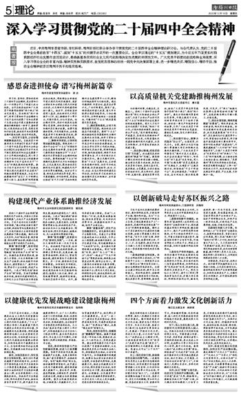 学习好、宣传好、贯彻好党的二十届四中全会精神,是当前和今后一个时期全市上下的重大政治任务。全市各级党组织和广大党员干部要深刻领悟“两个确立”的决定性意义,坚决做到“两个维护”,将学习贯彻四中全会精神与习近平总书记视察广东和出席第十五届全运会开幕式重要讲话重要指示精神要求一体学习、整体贯彻,以高度的政治自觉、思想自觉和行动自觉,推动党中央决策部署在梅州落地生根、结出丰硕成果。