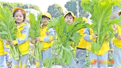 在田间地头,孩子们化身“小小菜农”,穿着雨靴,戴着手套,顶着帽子,像一个个蔬菜精灵(如图,华宣供)。老师俯身指导,细致讲解不同蔬菜的外形特征和生长习性,手把手示范摘蔬菜的技巧。孩子们也学得有模有样,小心翼翼地把青菜从地里拔出,轻轻抖落根部的泥土。有的蔬菜比孩子们还高,惹得现场阵阵欢笑。
