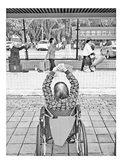 长廊里,响起东北大秧歌的欢快舞曲,一位善舞的大妈拿着彩扇踩着节拍领舞走在前面,几位老人手拿绢花或彩扇跟在后面,跟着秧歌舞蹈的节拍,在长廊里来回地扭着跳着。这气氛感染着长廊外坐轮椅看热闹的一位老人,她也情不自禁地伸开双臂,扭动身体,比画起来。