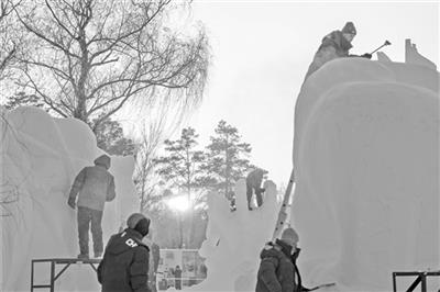 1月7日,在哈尔滨太阳岛雪博会第28届中国·哈尔滨国际雪雕比赛现场,选手在进行雪雕创作。