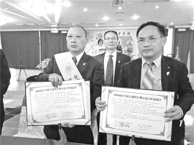 上杭李氏大宗祠管委会(李火德裔孙联谊总会)与台湾李氏宗亲总会签订永久交流协议。(李世盛/摄)