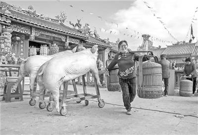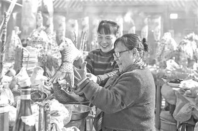 村民摆上祭品鱼,寓意年年有余。