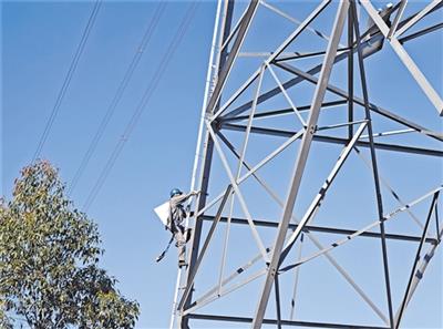 梅州供电局输电管理所组织工作人员对云嘉甲线164覆冰监测装置进行更换、维护。(张博 摄)