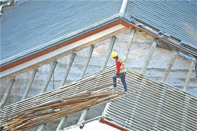 ▲嘉应古城历史文化街区保护提升项目,工人在屋顶工作。