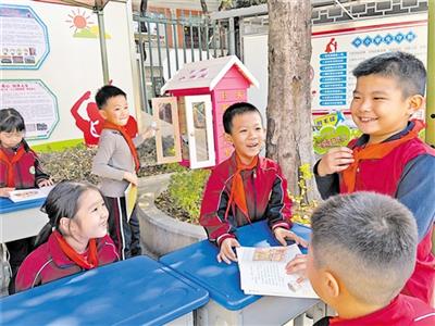 在作新小学的校门内侧,种着几棵苍翠欲滴的树木。树下那个新颖别致的粉红色小书屋特别惹人喜爱,里面摆放着各种书籍,这也为放学后等家长的孩子们提供了一个学习的好机会。每天都能看见三五成群的学生在知识的海洋里畅游,而呈现在他们面前的是一个五彩斑斓的大世界。看,孩子们眼里有光,快乐在洋溢!