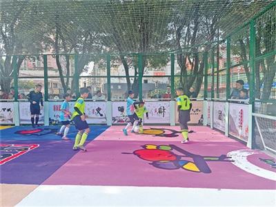 走进比赛现场,记者看到每一个球场都独具特色,8米宽、12米长、3米高的场地内,草皮上镶嵌着九宫格彩书“乐”字矩阵,围网挡板上印刻的《孟子》《论语》《新客家家训》等国学经典,成为流动的国学文化传播载体,让小球员在运动的间歇,潜移默化地接受传统文化熏陶。