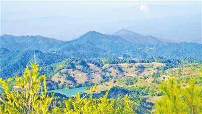 在山顶远眺,碧蓝的天空,层叠的群山,清澈的湖水以及起伏的茶田。