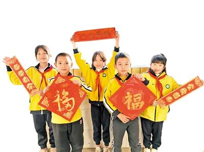梅江区人民小学的学生手举红纸,纸上满是新春期盼与文化热爱。