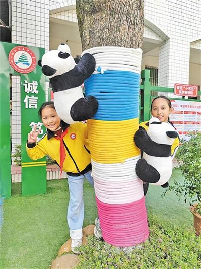 梅江区美华小学的师生们为学校的树木编织了五彩“暖衣”。