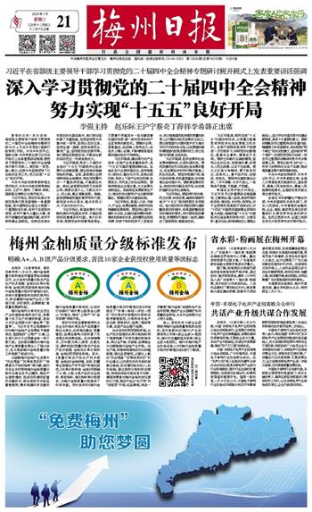 本报讯 (记者李艳良 通讯员彭伟录)1月20日,梅州金柚质量分级标准发布暨宣贯会在梅城召开,正式发布《质量分级农产品生产技术规程 金柚》《水果分级标准 金柚》两项团体标准和《梅州金柚质量分级评价管理办法》,并举行质量等级标志授权使用仪式,标志着梅州金柚产业迈入“标准引领、评价规范、品牌赋能”高质量发展新阶段。