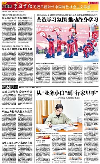 新闻写作曾是李小红的短板,她就将《解放军报》《中国国防报》刊登的优秀文章当范文,逐篇剖析结构、学习用语;主动与媒体编辑建立联系,虚心请教选题和写作技巧。政考业务不熟,她就“缠”着老同志请教,把要点记满笔记本,再对照政策规定反复练习。四年多来,她撰写的数百篇报道被国家级、省市级媒体刊发,摄影作品连续两年入选市、省“国防·强军杯”书画摄影展;2021年,李小红获评梅州军分区表彰的新闻舆论工作先进个人;2024年,李小红获评人武部优秀员工……