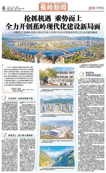 1月20日,中国共产党蕉岭县第十四次代表大会第六次会议暨县委经济工作会议召开,总结成绩鼓干劲,踔厉奋发开新局。报告《抢抓机遇 乘势而上 全力开创蕉岭现代化建设新局面》道出蕉岭县凝心聚力谋发展的决心和矢志为民谋幸福的初心,提振争先创优、实干担当的精气神,动员全县上下抢抓机遇、乘势而上,加力提速高质量打造“百千万工程”典型县和苏区融湾先行区综合示范窗口,全力开创蕉岭现代化建设新局面!